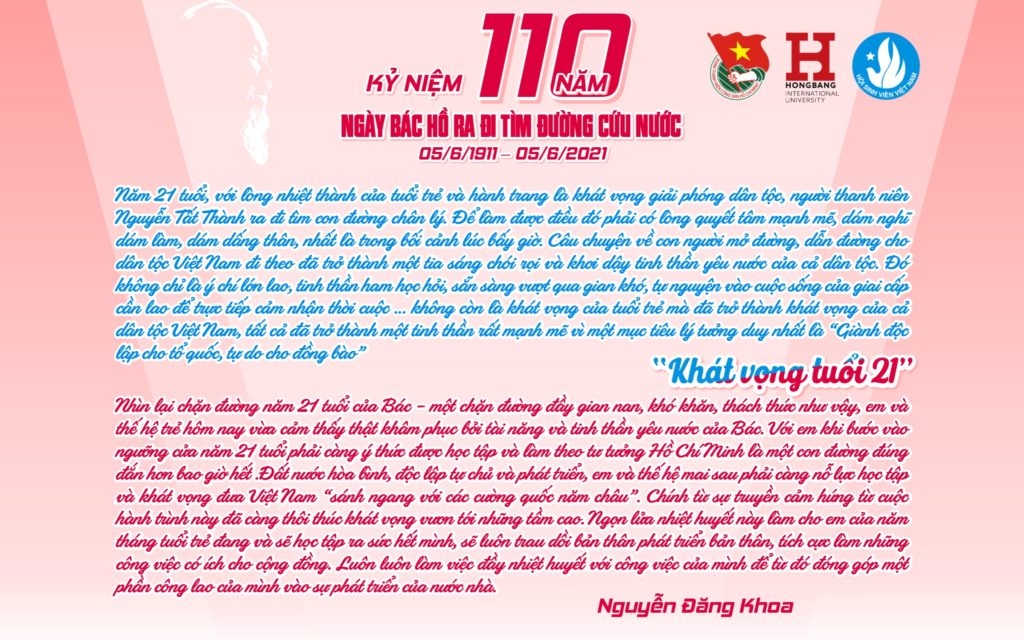 Kỷ niệm 110 Ngày Bác Hồ ra đi tìm đường cứu nước (05/6/1911 – 05/6/2021), cuộc thi “Khát vọng tuổi 21” là diễn đàn thể hiện khát vọng vươn lên của sinh viên Đại học Quốc tế Hồng Bàng.