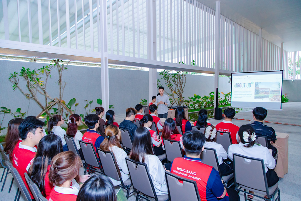 Trong khuôn khổ chương trình, sinh viên trực tiếp tham quan hệ thống không gian chức năng tại Wynnley Venue & Retreats của Zumstart, từ khu vực đón khách, sảnh tiệc đến không gian half-outdoor và outdoor. Qua việc quan sát bố cục không gian, cách bài trí table setup theo tiêu chuẩn yến tiệc, vật liệu và phong cách thiết kế, sinh viên hình dung rõ hơn tư duy tổ chức sự kiện và xây dựng trải nghiệm khách hàng trong mô hình dịch vụ cao cấp.