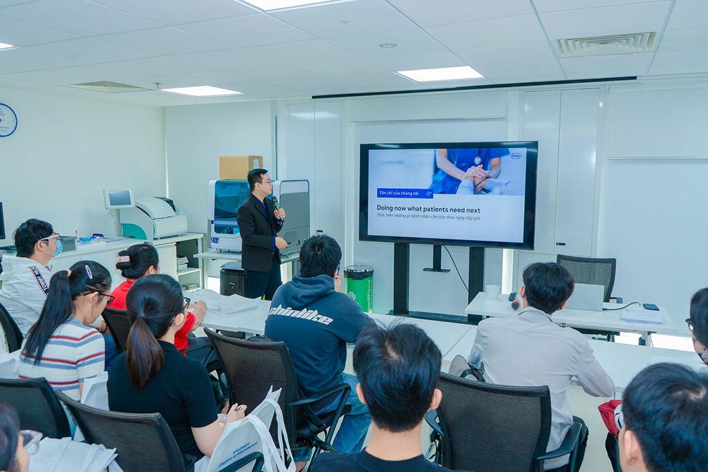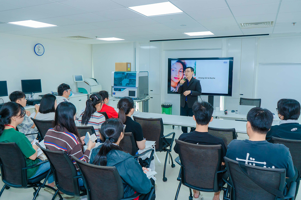 Dưới sự hướng dẫn của ông Phạm Trọng Tiến – Giám đốc Trung tâm Huấn luyện Chẩn đoán Kiểu mẫu Roche, sinh viên có cơ hội tiếp cận các công nghệ xét nghiệm sinh hóa – miễn dịch tiên tiến như kỹ thuật điện hóa phát quang, các dòng máy phân tích tự động và hệ thống xét nghiệm hoàn toàn tự động (Automation), những công nghệ đang được triển khai tại nhiều cơ sở y tế lớn tại TP.HCM và trên cả nước.