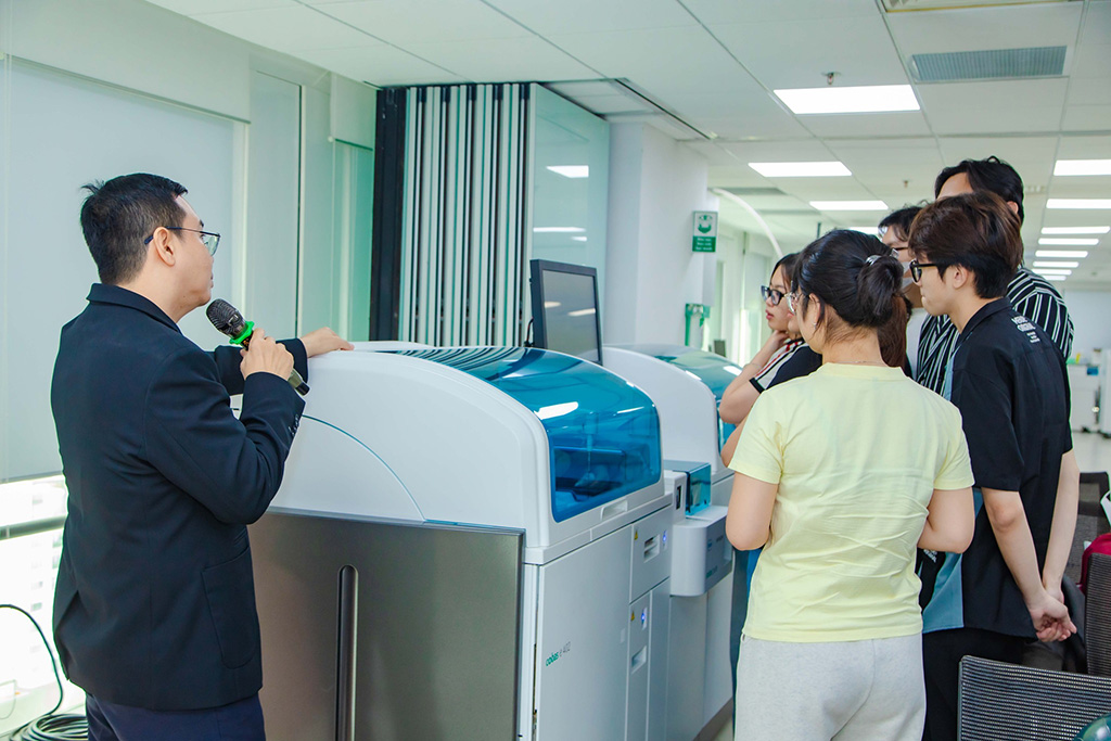 Không chỉ dừng lại ở tham quan, sinh viên được theo dõi trực tiếp quy trình vận hành thiết bị, kiểm soát chất lượng xét nghiệm và cách ứng dụng công nghệ trong thực tiễn lâm sàng. Việc trao đổi, đặt câu hỏi ngay trong môi trường làm việc thực tế giúp các kiến thức học trên giảng đường trở nên cụ thể, sinh động hơn, đồng thời giúp sinh viên hình dung rõ hơn vai trò, trách nhiệm và chuẩn mực nghề nghiệp của người làm công tác xét nghiệm trong hệ thống y tế hiện đại.