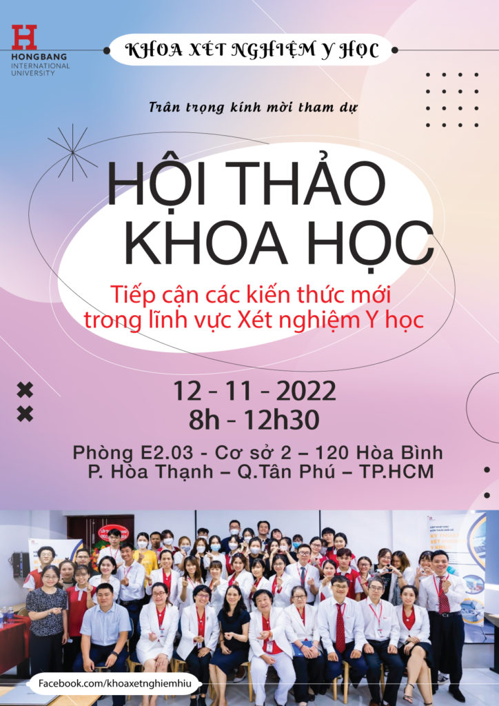 Vào ngày 12 tháng 11 năm 2022, để chào mừng kỷ niệm 25 năm Ngày Thành Lập Trường Đại học Quốc tế Hồng Bàng , Hội nghị khoa học “Tiếp cận các kiến thức mới trong lĩnh vực Xét nghiệm Y học” sẽ được tổ chức, với phần tham luận của các Phó Giáo sư, Tiến sĩ, thạc sĩ đến từ các bệnh viện lớn, cùng các giảng viên đầu ngành đang trực tiếp giảng dạy tại khoa.