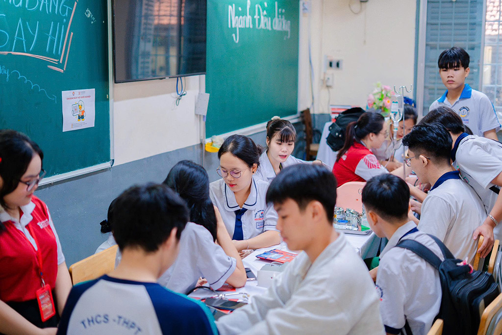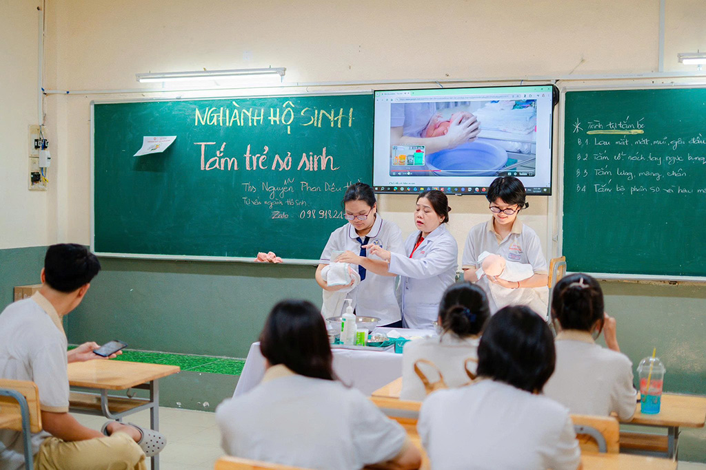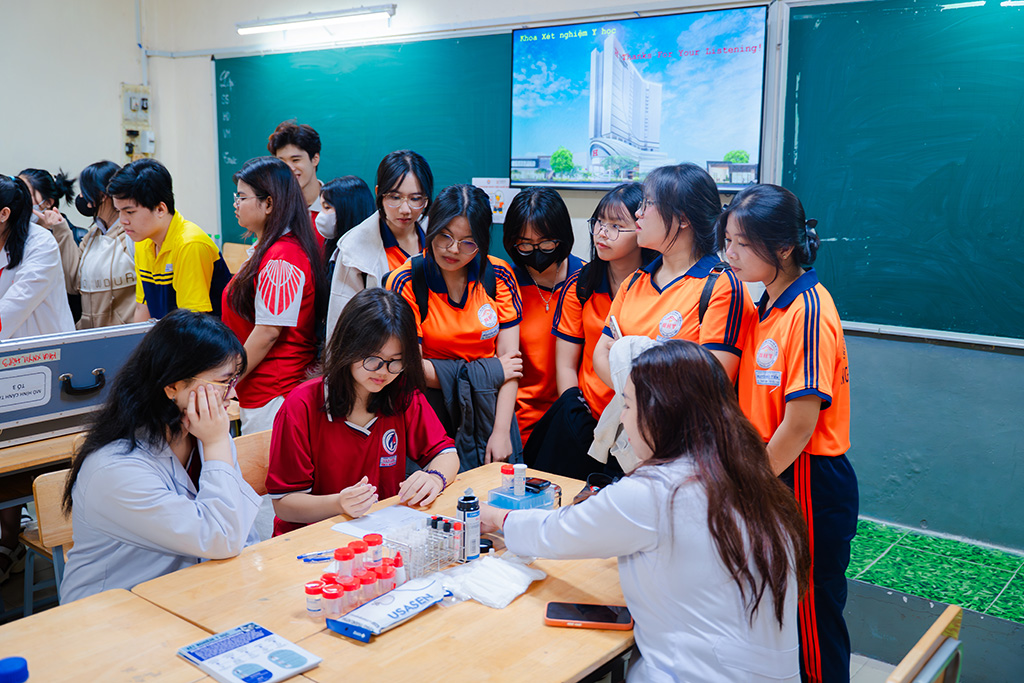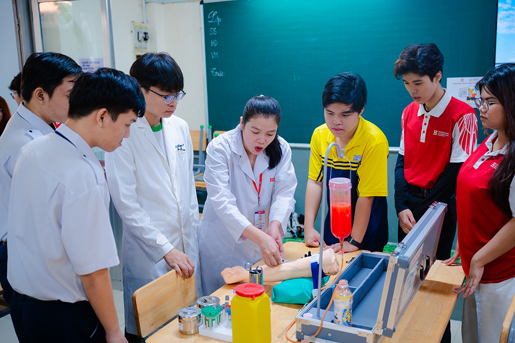 Học sinh cũng được tiếp cận một số hoạt động cơ bản của nhóm ngành sức khỏe như đo sinh hiệu, chăm sóc trẻ sơ sinh, quan sát quy trình xét nghiệm hay tìm hiểu ứng dụng của hợp chất thiên nhiên trong sản phẩm mỹ phẩm. Những trải nghiệm này giúp các em hiểu rõ hơn bức tranh nghề nghiệp trong lĩnh vực y tế và nhìn thấy khả năng mở rộng sang các mô hình sản phẩm chăm sóc sức khỏe, làm đẹp.