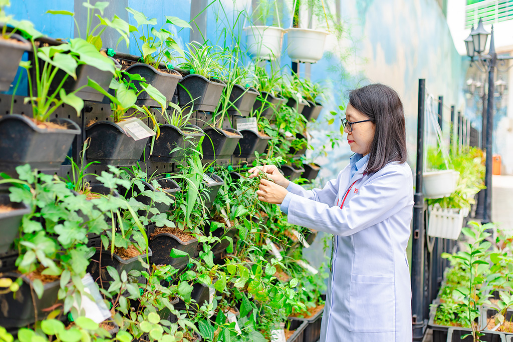 Nếu chỉ đi ngang qua, nhiều người có thể nghĩ đây đơn giản là một khu trồng cây cảnh. Nhưng với ThS.BS Nhan Hồng Tâm – Phó Trưởng Bộ môn Y học cổ truyền, Khoa Y, nơi này lại là một lớp học theo một cách rất khác.