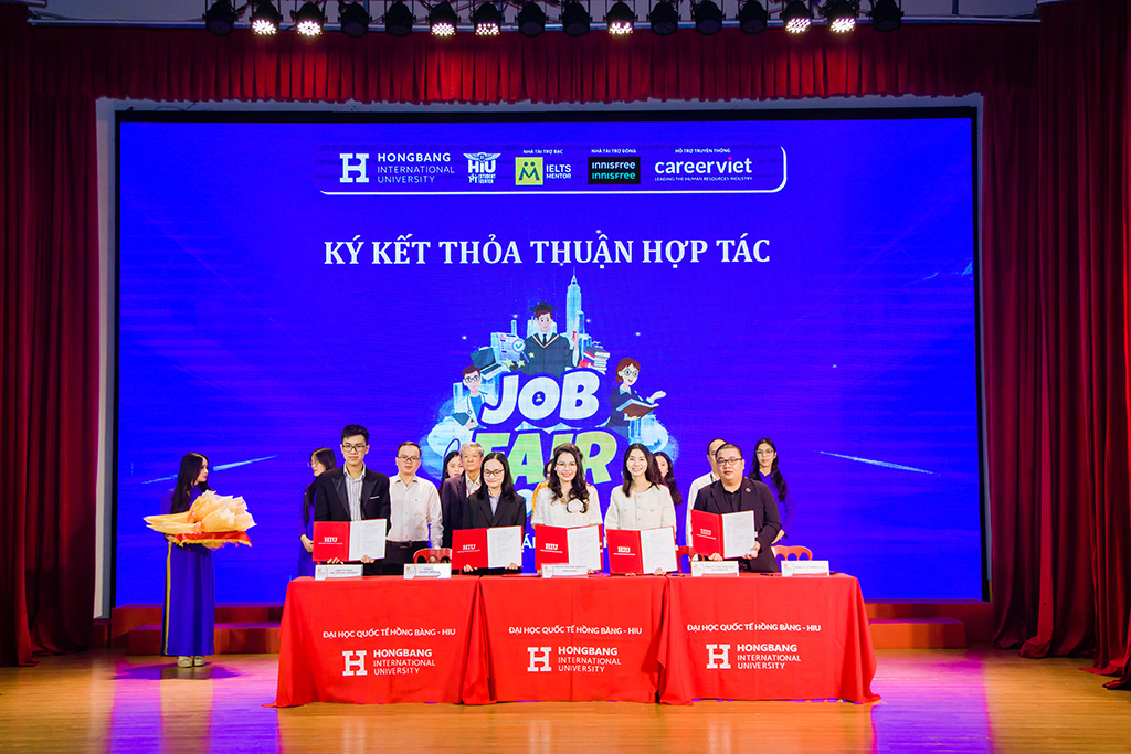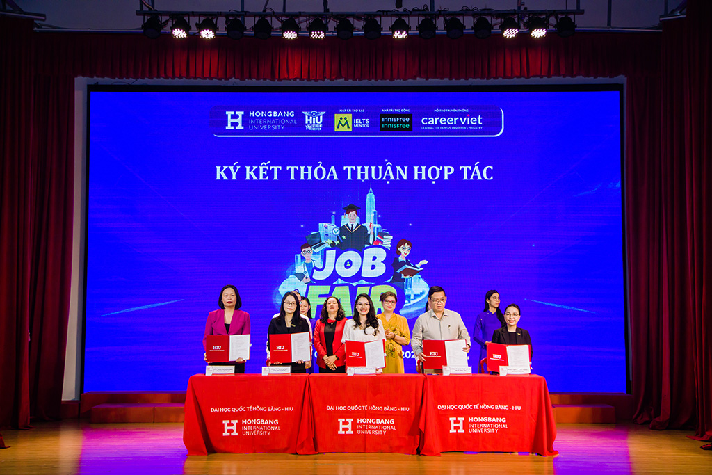 Một trong những điểm nhấn của Ngày hội Triển lãm và Tuyển dụng – Job Fair 2026 là Lễ ký kết biên bản ghi nhớ hợp tác (MOU) giữa Trường Đại học Quốc tế Hồng Bàng và các doanh nghiệp đối tác. Các thỏa thuận hợp tác nhằm mở rộng cơ hội thực tập, kiến tập, đào tạo ứng dụng và tuyển dụng cho sinh viên trong thời gian tới, đồng thời tăng cường sự đồng hành của doanh nghiệp trong quá trình đào tạo.