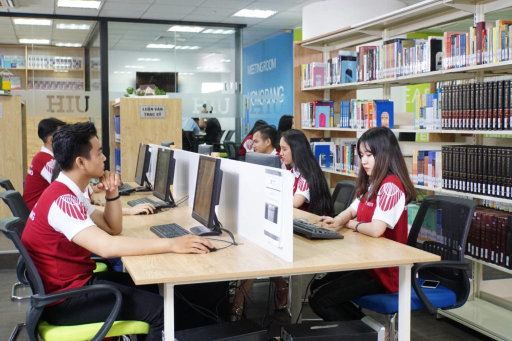 Thư viện tại HIU hiện có khoảng 13.217 đầu sách với 23.292 bản sách phân bổ ở các chương trình đào tạo của trường. HIU còn trang bị thư viện số với thuvienso.hiu.vn, cập nhật dữ liệu trực tuyến của gần 100 trường đại học và cao đẳng trong cả nước, với hơn 1,4 triệu tài liệu phục vụ quá trình học tập, nghiên cứu của sinh viên.