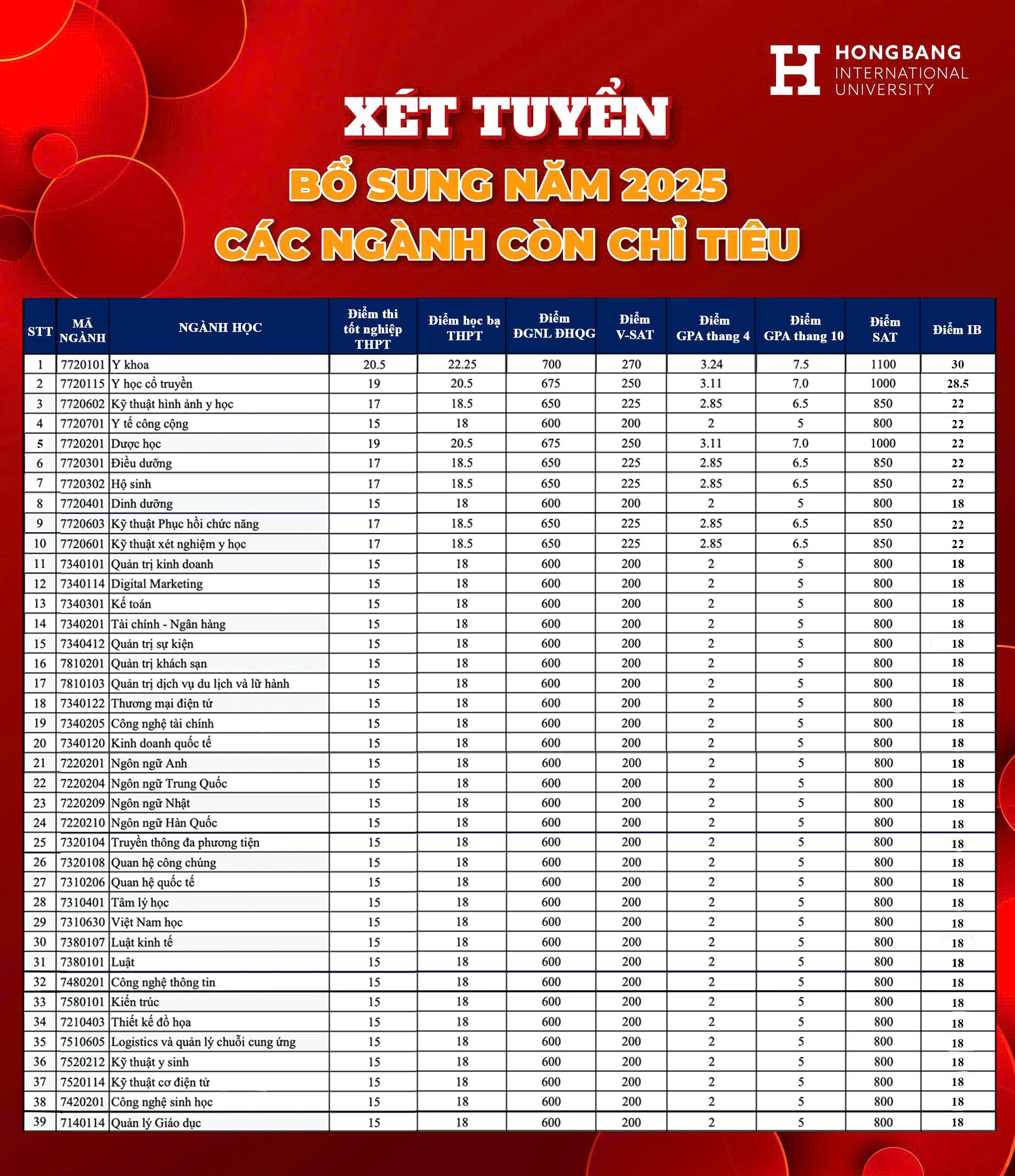 Trường Đại học Quốc tế Hồng Bàng (HIU) thông báo nhận hồ sơ xét tuyển bổ sung đến hết ngày 15/10/2025 cho nhiều ngành đào tạo chính quy. Tân sinh viên trúng tuyển đợt này sẽ được trao học bổng IELTS 60% cùng nhiều quà tặng hấp dẫn.